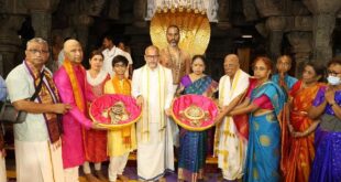 -రూ. 2.40 కోట్ల విలువగల శంఖు, చక్రాల వితరణ తిరుమల, నేటి పత్రిక ప్రజావార్త : తిరుమల వెంకన్నకు మంగళవారం రెండన్నర కిలోల భారీ బంగారు కానుక అందింది. చెన్నైకు చెందిన సుదర్శన్ ఎంటర్ ప్రైజెస్ సంస్థ తిరుమల శ్రీ వేంకటేశ్వర స్వామికి మంగళవారం సుమారు రూ.2.40 కోట్లు విలువైన దాదాపు రెండున్నర కేజీల బంగారు శంఖు, చక్రాలను విరాళంగా అందించింది.ఈ మేరకు ఆ సంస్థ ప్రతినిధులు శ్రీవారి ఆలయంలోని రంగ నాయకుల మండపంలో టీటీడీ అదనపు ఈవో సి.హెచ్.వెంకయ్య చౌదరికి శంఖు, చక్రాలను …