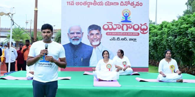 మే 21 నుంచి జూన్ 21 వరకు యోగాంధ్ర మాసోత్సవాల్లో భాగంగా వార్డ్, సర్కిల్ స్థాయి యోగా పోటీలు జరగనున్నాయని.. వార్డ్ స్థాయి విజేతలు సర్కిల్ స్థాయికి, సర్కిల్ స్థాయి విజేతలు జిల్లాస్థాయికి, జిల్లాస్థాయి విజేతలు రాష్ట్రస్థాయికి అర్హత సాధిస్తారని విజయవాడ నగర పాలక సంస్థ కమిషనర్ ధ్యానచంద్ర బుధవారం కనకదుర్గ వారధి వద్దగల రివర్ ఫ్రెంట్ పార్క్ లో నిర్వహించిన యోగాంధ్ర కార్యక్రమంలో పాల్గొని , నగర ప్రజలకు పిలుపునిచ్చారు. ఆసనాల ప్రదర్శన (సూర్య నమస్కార్ ఛాలెంజ్, ప్రాణాయామం, మెడిటేషన్), ఆర్టిస్టిక్ యోగా (యోగా సాంగ్, యోగా పెయింటింగ్, యోగా స్కిట్, రోల్ప్లే), వైజ్ఞానికి యోగా (యోగా క్విజ్, యోగా పోస్టర్, యోగా స్లోగన్, యోగా ఎస్సే), యోగా షార్ట్ఫిల్మ్, యోగా ఫొటోగ్రఫీలో పోటీలు జరుగుతాయని, గ్రూప్ విభాగంలో సింక్రనైజ్డ్ గ్రూప్ యోగా, మిక్స్డ్ ఏజ్ గ్రూప్ యోగా పోటీలు నిర్వహించనున్నట్లు తెలిపారు. జూనియర్ గ్రూప్ (10-18 ఏళ్లు), యంగ్ గ్రూప్ (19-35 ఏళ్లు), సీనియర్ గ్రూప్ (35 ఏళ్లు, ఆపైన) కేటగిరీల్లో పోటీలు జరుగుతాయని.. వార్డు స్థాయి పోటీలు మే 26 నుంచి 30వ తేదీ వరకు జరుగుతాయని.. ఔత్సాహికులు ఆయా వార్డ్ కార్యదర్శిని సంప్రదించాలని సూచించారు. యోగా స్లోగన్, యోగా షార్ట్ఫిల్మ్, యోగా ఫొటోగ్రఫీ విభాగాల్లో పోటీపడాలనుకునే ఔత్సాహికులు తమ ఎంట్రీలను జూన్ 10వ తేదీలోగా vmcyogandhra@gmail.com మెయిల్కు పంపించాల్సి ఉంటుందని, తమ ఎంట్రీలతో పాటు పేరు, చిరునామా, మొబైల్ నంబరు వివరాలను తెలియజేయాలి. వివిధ పోటీల్లో విజేతలకు అవార్డుల ప్రదానం ఉంటుందని, ఔత్సాహికులు ఈ అవకాశాన్ని సద్వినియోగం చేసుకోవాలని కమిషనర్ ధ్యానచంద్ర సూచించారు. ఈ కార్యక్రమంలో జోనల్ కమిషనర్ కే షమీ, ప్రాజెక్ట్ ఆఫీసర్ (యు సి డి) విభాగం పి వెంకట నారాయణ, సిబ్బంది, ప్రజలు పాల్గొన్నారు.