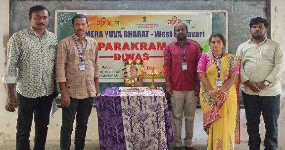 “మేరా యువ భారత్-మినిస్ట్రీ ఆఫ్ అఫైర్స్ అండ్ స్పోర్ట్స్ ” ఆధ్వర్యంలో, నేతాజీ సుభాష్ చంద్రబోస్ జన్మదినోత్సవం లో భాగంగా పరాక్రమ్ దివాస్ అనే కార్యక్రమాన్ని K.G.R.L డిగ్రీ కాలేజ్ భీమవరం లో నిర్వహించడం జరిగింది. ఈ కార్యక్రమానికి ముఖ్యఅతిథిగా విచ్చేసిన కళాశాల ప్రిన్సిపాల్ ఇంటి రామచంద్రమూర్తి గారు ఈ కార్యక్రమాన్ని ఉద్దేశించి మాట్లాడుతూ నేతాజీ సుభాష్ చంద్రబోస గారిని అందరూ ఆదర్శంగా తీసుకొని ఎదగాలని కోరుకున్నారు నేతాజీ సుభాష్ చంద్రబోస గారి జీవితంలో జరిగిన కొన్ని సంఘటనలను విద్యార్థులకు తెలిపారు విద్యార్థి దశలో ఉన్నప్పుడు అలవర్చుకోవాల్సిన కొన్ని నాయకత్వ లక్షణాలను విద్యార్థులకు తెలియజేశారు దేశ సైన్యం ఏర్పాట్లు ఆయన పాత్ర ఎనలేనిదని కొనియాడారు దేశానికి ఉపయోగపడే ఏ ఒక్క కార్యక్రమమైనా ముందుండి నడిపించే వారిని అన్నారు అండ్ కాలేజ్ స్టాఫ్ మైభారత్ యువర్ వాలంటీర్ తదితరులు పాల్గొన్నారు .