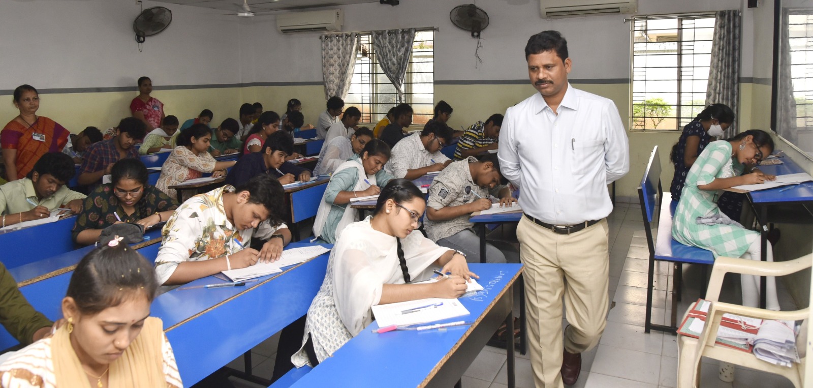 జిల్లాలో ఇంటర్మీడియట్ పరీక్షలను అత్యంత కట్టుదిట్టమైన ఏర్పాట్లతో ప్రశాంతంగా నిర్వహిస్తున్నామని తొలిరోజు మొదటి సంవత్సరం పరీక్షకు 99 కేంద్రాల ద్వారా 39,544 మంది విద్యార్థులకుగాను 38,822 మంది హాజరు కాగా 722 మంది గైరుహాజరైనట్లు జిల్లా కలెక్టర్ ఢిల్లీరావు తెలిపారు. జిల్లాలో శుక్రవారం నుండి ప్రారంభమైన ఇంటర్మీడియట్ పరీక్షల నిర్వహణను జిల్లా కలెక్టర్ ఢిల్లీరావు పరిశీలించారు. నగరంలోని బిషప్ అజరయ్య జూనియర్ కళాశాల, శ్రీ శారద కళాశాలలో నిర్వహిస్తున్న పరీక్షా కేంద్రాన్ని ఆయన సందర్శించారు. అనంతరం జిల్లా కలెక్టర్ ఢిల్లీరావు మాట్లాడుతూ జిల్లాలో మొదటి సంవత్సరం ఇంటర్మీడియట్ పరీక్షలకు సంబంధించి 39,544 మంది విద్యార్థులు పరీక్షలకు హాజరుకావాల్సి ఉండగా 38,822 మంది విద్యార్థులు పరీక్షకు హాజరుకావడం జరిగిందన్నారు. ఇంటర్మీడియట్ పరీక్షలకు హాజరయ్యే విద్యార్థులకు ఎటువంటి ఇబ్బందులు కలగకుండా అవసరమైన అన్ని ఏర్పాట్లు చేయడం జరిగిందన్నారు. పరీక్షలను పారదర్శకంగా ప్రశాంత వాతావారణంలో నిర్వహిస్తున్నట్లు తెలిపారు. ప్రతి పరీక్షా కేంద్రం గది లో సీసీ కెమెరాలను ఏర్పాటు చేయడం జరిగిందన్నారు. పరీక్షా కేంద్రాల వద్ద 144 సెక్షన్ అమలు చేస్తున్నట్లు తెలిపారు. పరీక్షా కేంద్రాలలోనికి ఎటువంటి ఎలక్ట్రానిక్ వస్తువులను అనుమతించడం లేదన్నారు. విద్యార్థులను క్షుణ్ణంగా పరీక్షించి మాల్ ప్రాక్టీస్ కు పాల్పడకుండా పటిష్టమైన చర్యలు తీసుకున్నామన్నారు. ఒక్కొక్క పరీక్షా కేంద్రానికి ఒక చీఫ్ సూపెరిండెంటెంట్, రెండు ఫ్లైయింగ్ స్క్వాడ్ లను, రెండు సిట్టింగ్ స్క్వాడ్ లను, 3 వేల 500 మంది ఇన్విజిలేటర్లను నియమించి పరీక్షలను పర్యవేక్షిస్తున్నట్లు తెలిపారు. పరీక్షా కేంద్రాలలో నిరంతరం విద్యుత్ సరఫరా, త్రాగు నీరు వంటి సౌకర్యాలను కల్పించామన్నారు. పరీక్ష హాజరయ్యే విద్యార్థుల సౌకర్యార్థం ఏపిఎస్ఆర్టిసి ప్రత్యేక బస్సులను ఏర్పాటు చేయడం జరిగిందని జిల్లా కలెక్టర్ ఢిల్లీరావు తెలిపారు.
